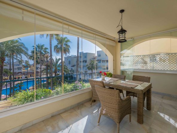 Este precioso apartamento, situado en una planta intermedia, cuenta con 2 dormitorios y 2 baños, un amplio salón-comedor y una terraza cubierta acristalada con vistas al jardín y al mar. Además, hay una terraza abierta, accesible tanto desde la terraza cubierta como desde el dormitorio principal. Ambas terrazas están orientadas al sur, lo que garantiza una abundante luz natural y sol durante todo el día.