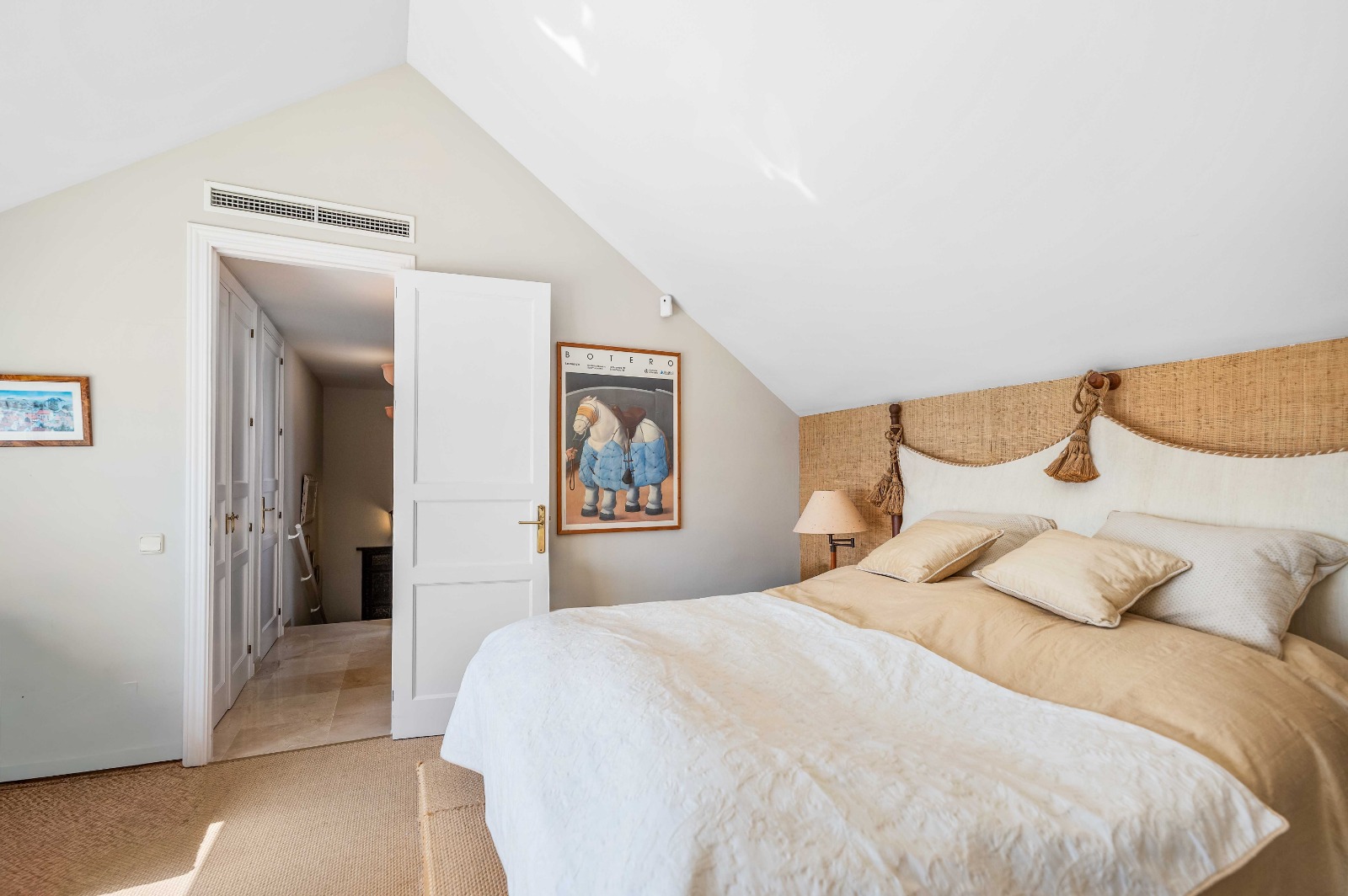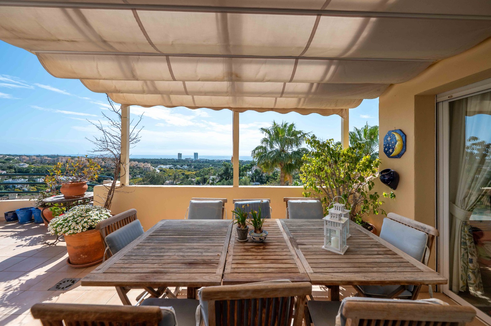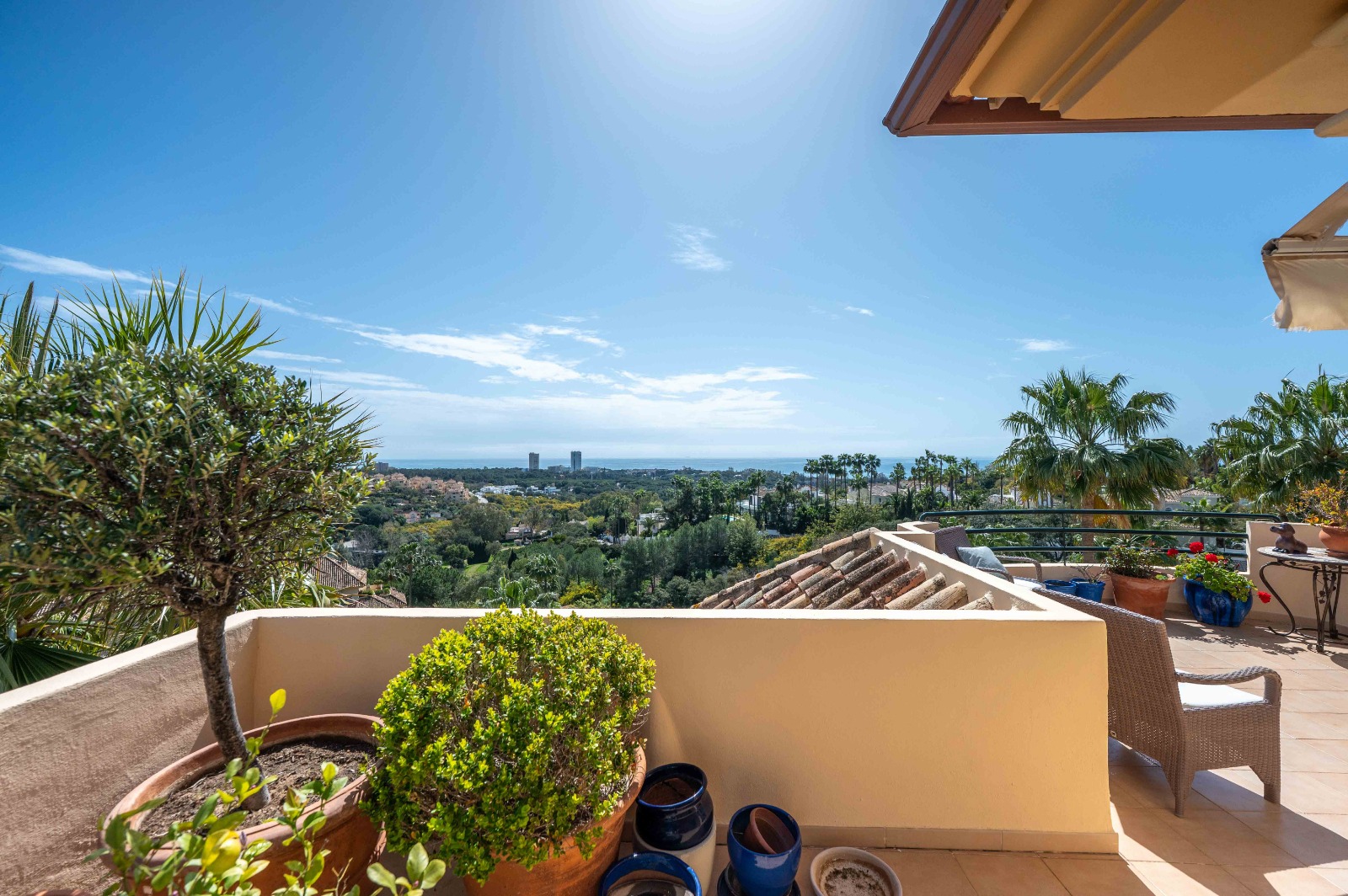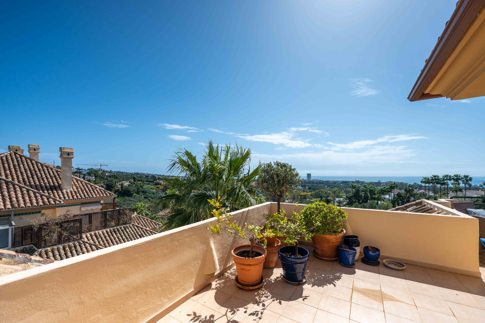 Ático con vistas panorámicas al mar en venta en Elviria Hills, Marbella Impresionante ático con una ubicación única en primera línea, que ofrece vistas panorámicas a los jardines y al mar Mediterráneo, rodeado de palmeras y bosque de pinos. La vivienda destaca por sus amplias dimensiones, abundante luz natural y una experiencia de vida única en un entorno altamente atractivo con gran privacidad. La propiedad cuenta con 147 m² de superficie interior, además de una espaciosa terraza de 57 m² con triple orientación (sur, este y oeste). Esto garantiza sol durante todo el día y crea múltiples zonas exteriores, ideales para relajarse, recibir invitados o simplemente disfrutar del entorno en cualquier momento. La vivienda dispone de suelos de mármol en todas las estancias, climatización (frío/calor), plaza de garaje subterránea y trastero. El salón es amplio y acogedor, con chimenea y grandes ventanales que inundan el espacio de luz natural, además de acceso directo a la terraza. El resultado es una perfecta conexión entre interior y exterior, realzada por las vistas abiertas al Mediterráneo y al paisaje verde. La cocina está completamente equipada y tiene acceso directo a una terraza trasera, ideal para disfrutar tanto por la mañana como por la tarde. En esta planta también se encuentran dos cómodos dormitorios y dos baños, diseñados cuidadosamente para garantizar confort y privacidad. La planta superior está dedicada a la suite principal, con un encantador diseño tipo loft, armarios empotrados y baño en suite. Elviria Hills se encuentra en una de las zonas más demandadas al este de Marbella y ofrece una amplia gama de servicios de alta calidad, incluyendo un campo de golf de 9 hoyos, pistas de tenis, gimnasio, sauna y un reconocido restaurante dentro del complejo. La urbanización es conocida por sus cuidados jardines y su ambiente tranquilo. A 5 minutos en coche se encuentran dos centros comerciales con bares, restaurantes, bancos, peluquerías, supermercados, dentistas, médicos y muchos otros servicios, como una oficina de correos, una floristería y farmacias. Algunas de las mejores escuelas de la zona, como el Colegio Alemán y el English International College, se encuentran a solo 10 minutos. Se puede llegar al centro de Marbella en 10 minutos, a Puerto Banús en 15 minutos y al aeropuerto de Málaga en aproximadamente, 40 minutos. |