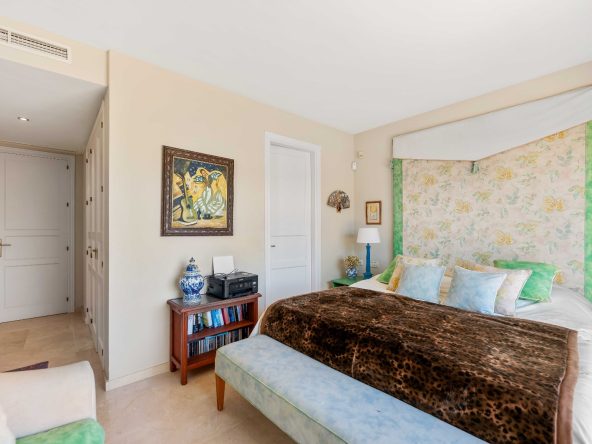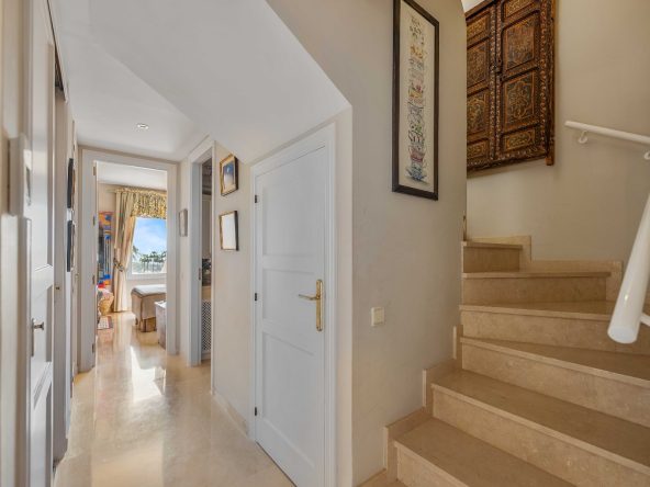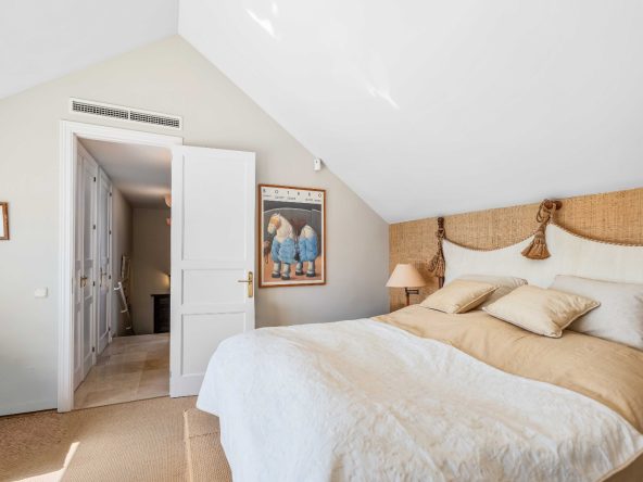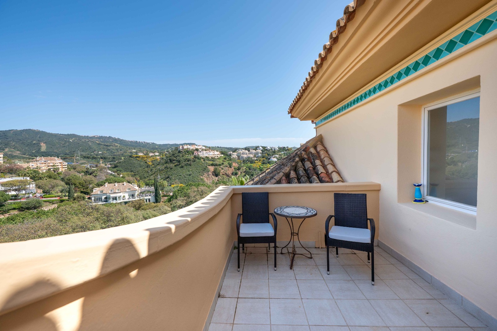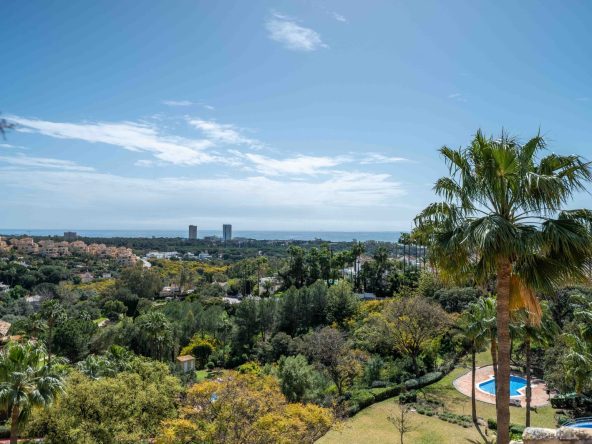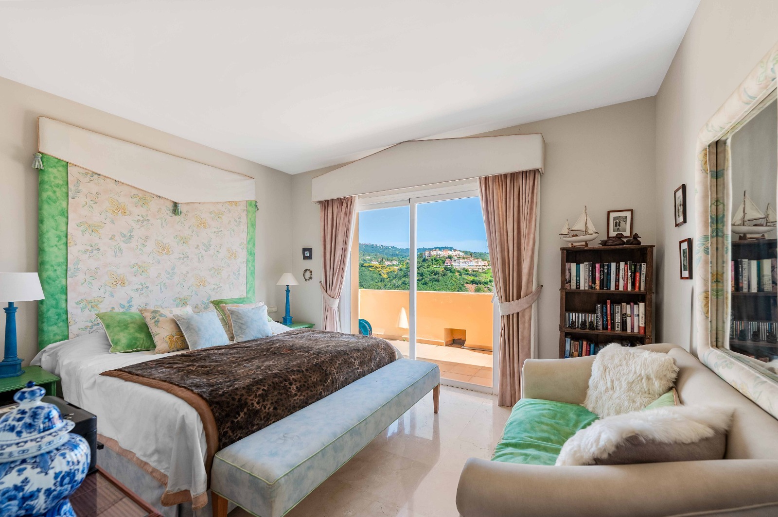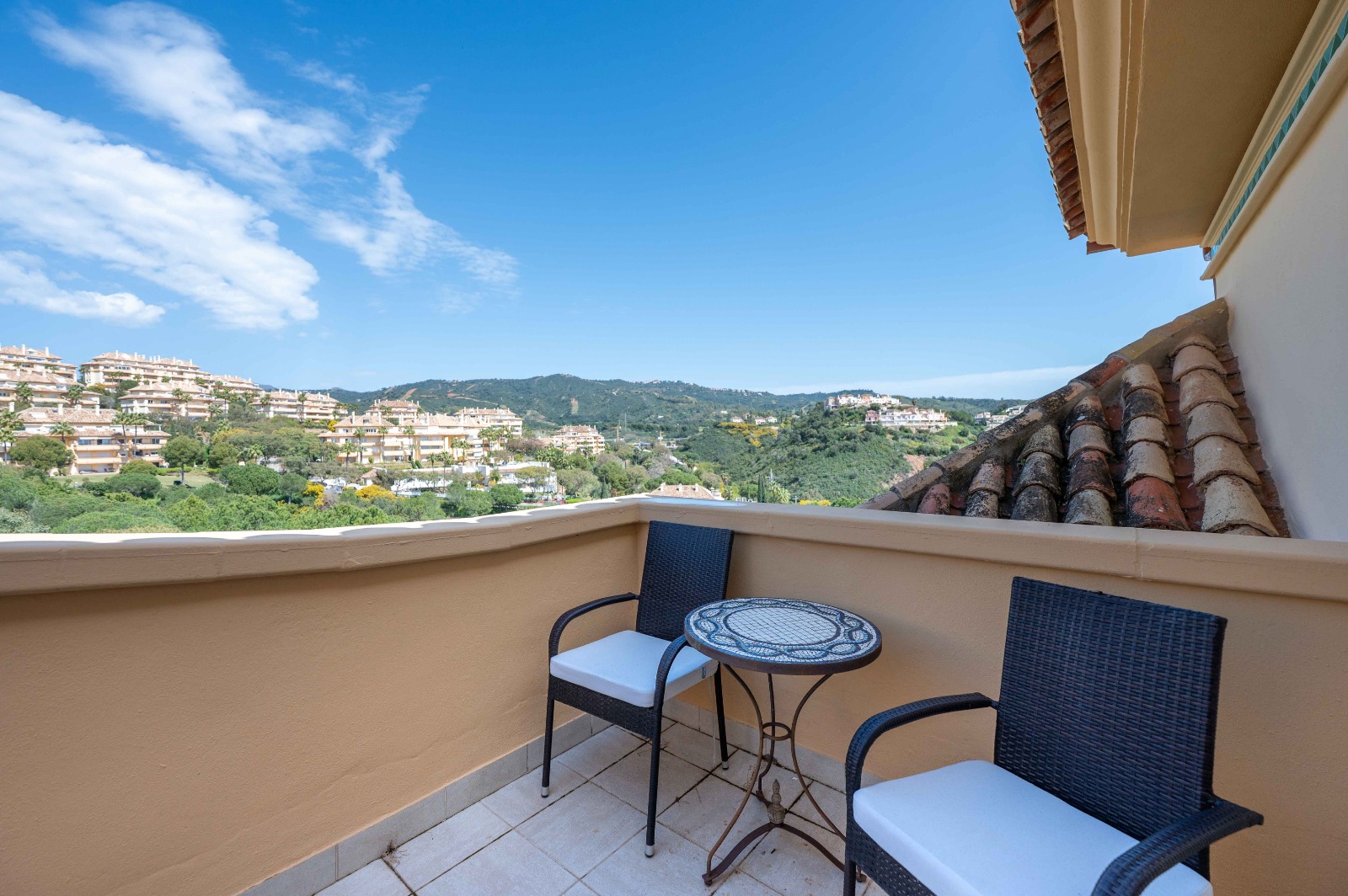 Ático con vistas panorámicas al mar en venta en Elviria Hills, Marbella Impresionante ático con una ubicación única en primera línea, que ofrece vistas panorámicas a los jardines y al mar Mediterráneo, rodeado de palmeras y bosque de pinos. La vivienda destaca por sus amplias dimensiones, abundante luz natural y una experiencia de vida única en un entorno altamente atractivo con gran privacidad. La propiedad cuenta con 147 m² de superficie interior, además de una espaciosa terraza de 57 m² con triple orientación (sur, este y oeste). Esto garantiza sol durante todo el día y crea múltiples zonas exteriores, ideales para relajarse, recibir invitados o simplemente disfrutar del entorno en cualquier momento. La vivienda dispone de suelos de mármol en todas las estancias, climatización (frío/calor), plaza de garaje subterránea y trastero. El salón es amplio y acogedor, con chimenea y grandes ventanales que inundan el espacio de luz natural, además de acceso directo a la terraza. El resultado es una perfecta conexión entre interior y exterior, realzada por las vistas abiertas al Mediterráneo y al paisaje verde. La cocina está completamente equipada y tiene acceso directo a una terraza trasera, ideal para disfrutar tanto por la mañana como por la tarde. En esta planta también se encuentran dos cómodos dormitorios y dos baños, diseñados cuidadosamente para garantizar confort y privacidad. La planta superior está dedicada a la suite principal, con un encantador diseño tipo loft, armarios empotrados y baño en suite. Elviria Hills se encuentra en una de las zonas más demandadas al este de Marbella y ofrece una amplia gama de servicios de alta calidad, incluyendo un campo de golf de 9 hoyos, pistas de tenis, gimnasio, sauna y un reconocido restaurante dentro del complejo. La urbanización es conocida por sus cuidados jardines y su ambiente tranquilo. A 5 minutos en coche se encuentran dos centros comerciales con bares, restaurantes, bancos, peluquerías, supermercados, dentistas, médicos y muchos otros servicios, como una oficina de correos, una floristería y farmacias. Algunas de las mejores escuelas de la zona, como el Colegio Alemán y el English International College, se encuentran a solo 10 minutos. Se puede llegar al centro de Marbella en 10 minutos, a Puerto Banús en 15 minutos y al aeropuerto de Málaga en aproximadamente, 40 minutos. |