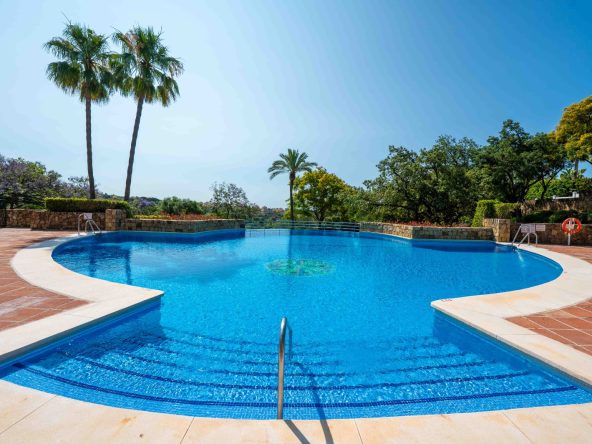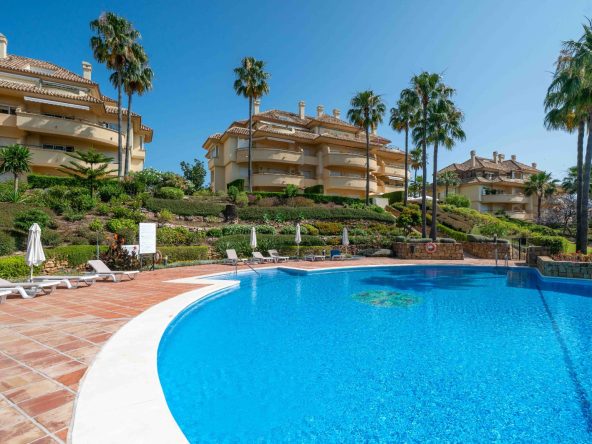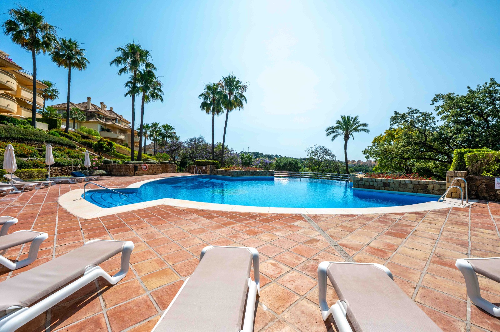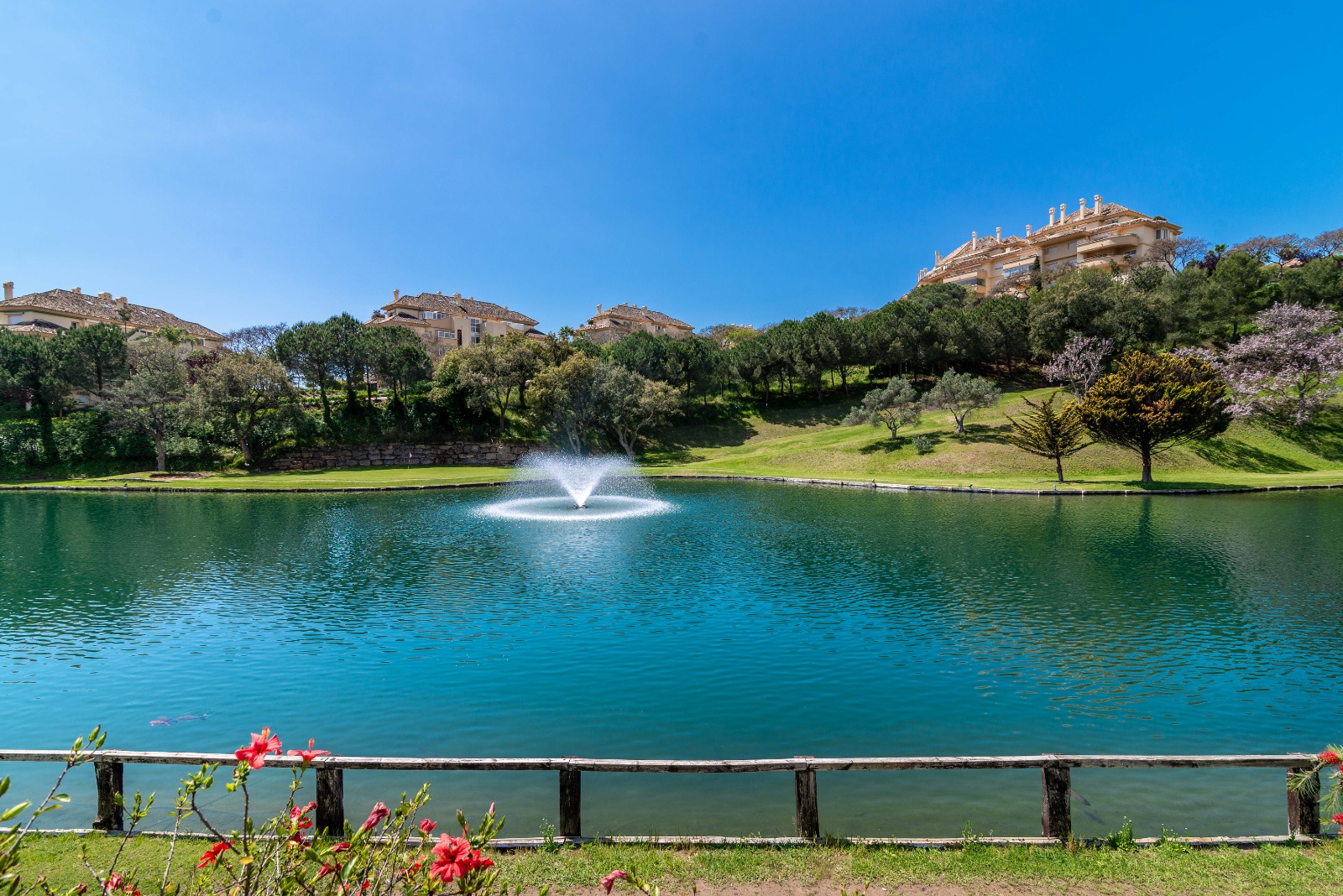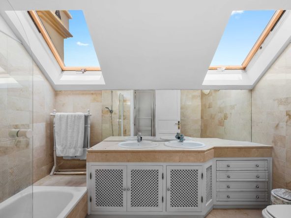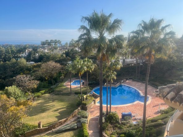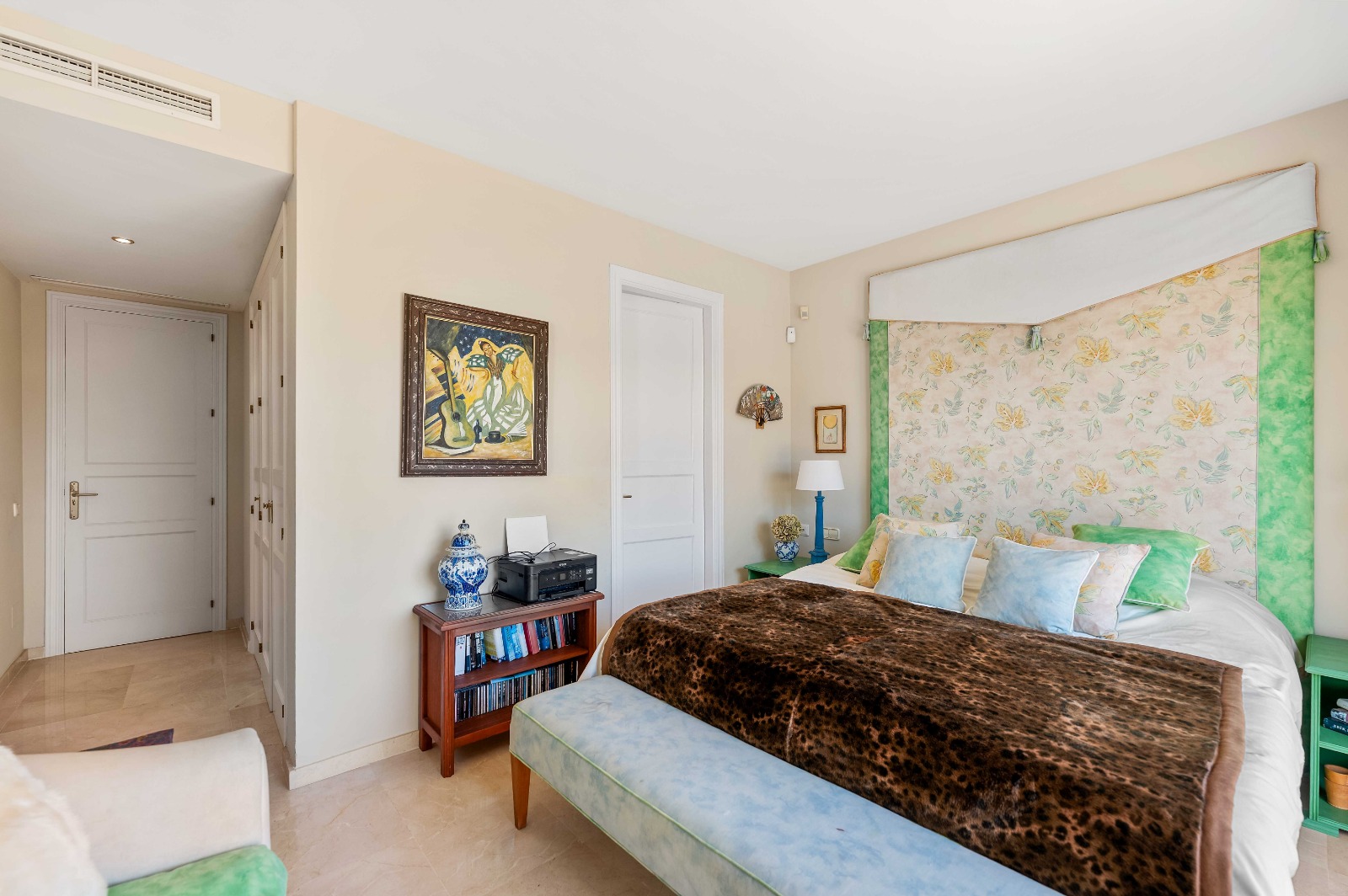Ático con vistas panorámicas al mar en venta en Elviria Hills, Marbella Impresionante ático con una ubicación única en primera línea, que ofrece vistas panorámicas a los jardines y al mar Mediterráneo, rodeado de palmeras y bosque de pinos. La vivienda destaca por sus amplias dimensiones, abundante luz natural y una experiencia de vida única en un entorno altamente atractivo con gran privacidad. La propiedad cuenta con 147 m² de superficie interior, además de una espaciosa terraza de 57 m² con triple orientación (sur, este y oeste). Esto garantiza sol durante todo el día y crea múltiples zonas exteriores, ideales para relajarse, recibir invitados o simplemente disfrutar del entorno en cualquier momento. La vivienda dispone de suelos de mármol en todas las estancias, climatización (frío/calor), plaza de garaje subterránea y trastero. El salón es amplio y acogedor, con chimenea y grandes ventanales que inundan el espacio de luz natural, además de acceso directo a la terraza. El resultado es una perfecta conexión entre interior y exterior, realzada por las vistas abiertas al Mediterráneo y al paisaje verde. La cocina está completamente equipada y tiene acceso directo a una terraza trasera, ideal para disfrutar tanto por la mañana como por la tarde. En esta planta también se encuentran dos cómodos dormitorios y dos baños, diseñados cuidadosamente para garantizar confort y privacidad. La planta superior está dedicada a la suite principal, con un encantador diseño tipo loft, armarios empotrados y baño en suite. Elviria Hills se encuentra en una de las zonas más demandadas al este de Marbella y ofrece una amplia gama de servicios de alta calidad, incluyendo un campo de golf de 9 hoyos, pistas de tenis, gimnasio, sauna y un reconocido restaurante dentro del complejo. La urbanización es conocida por sus cuidados jardines y su ambiente tranquilo. A 5 minutos en coche se encuentran dos centros comerciales con bares, restaurantes, bancos, peluquerías, supermercados, dentistas, médicos y muchos otros servicios, como una oficina de correos, una floristería y farmacias. Algunas de las mejores escuelas de la zona, como el Colegio Alemán y el English International College, se encuentran a solo 10 minutos. Se puede llegar al centro de Marbella en 10 minutos, a Puerto Banús en 15 minutos y al aeropuerto de Málaga en aproximadamente, 40 minutos. |
