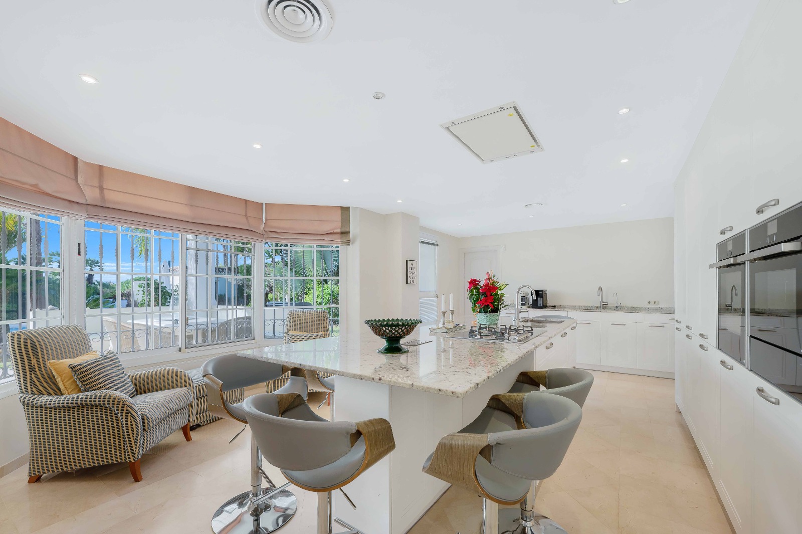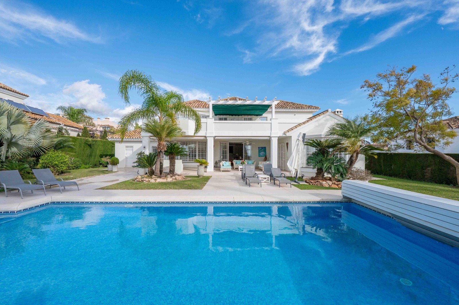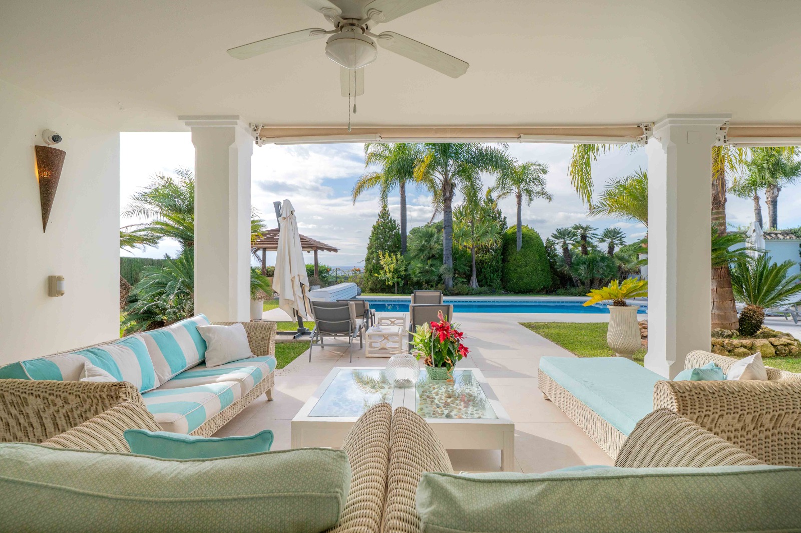 Utendørs åpner en stor overbygd terrasse med flere sitte- og spiseområder ut mot den vakkert vedlikeholdte hagen og saltvannsbassenget, noe som skaper en ideell setting for avslapning og utendørsliv.