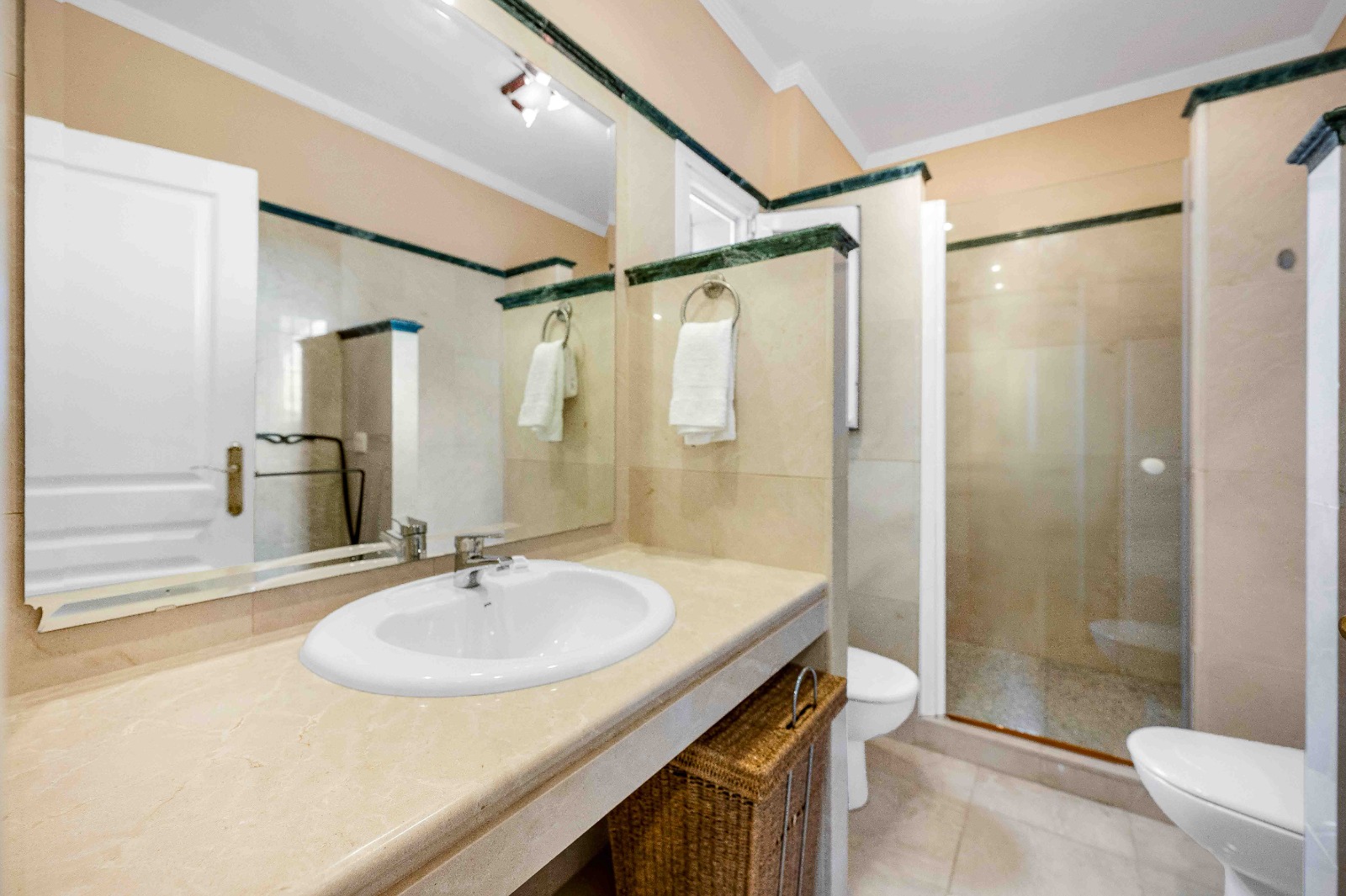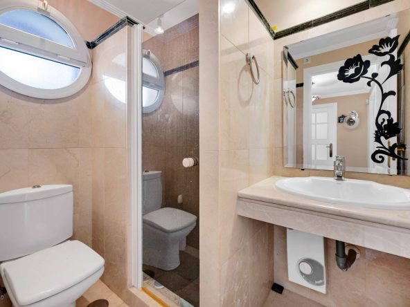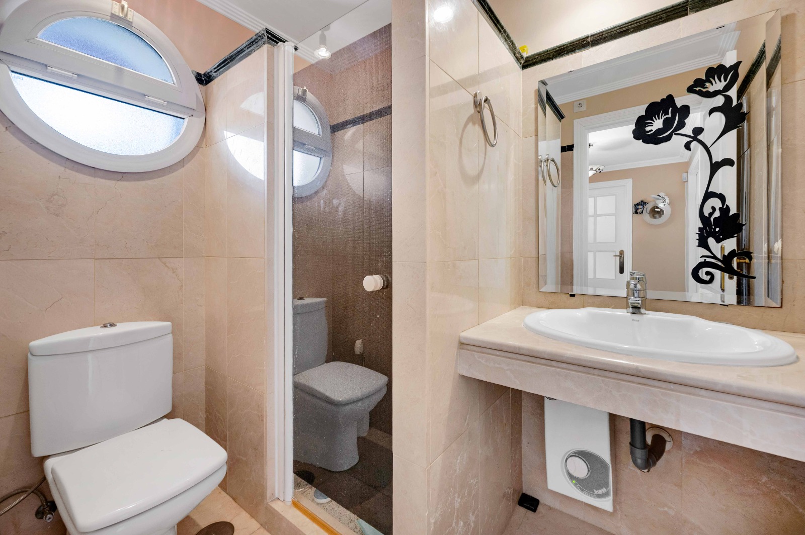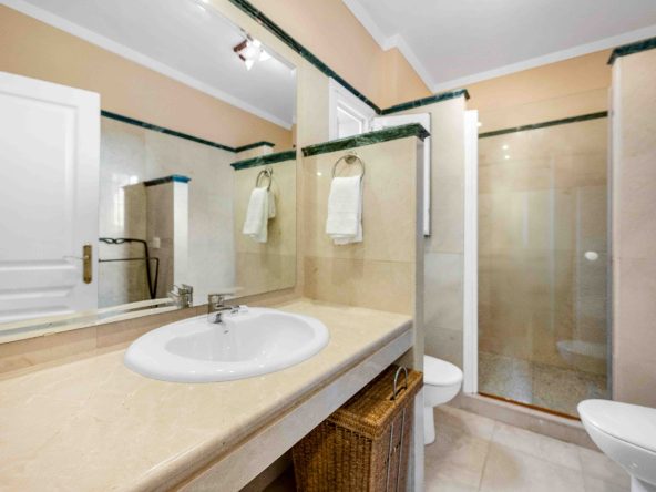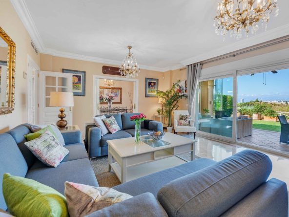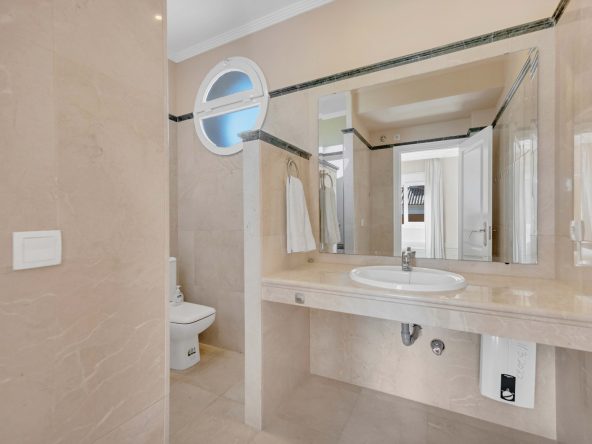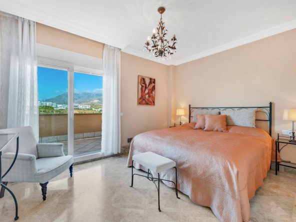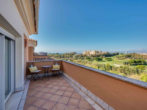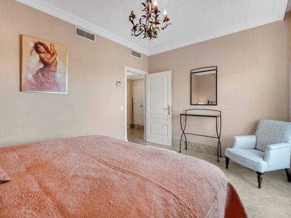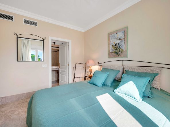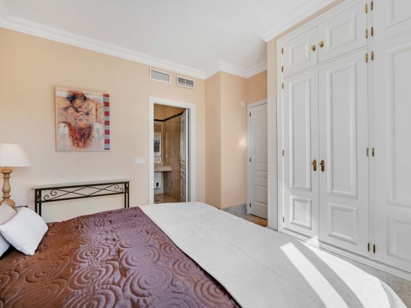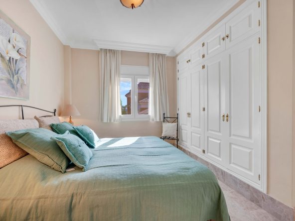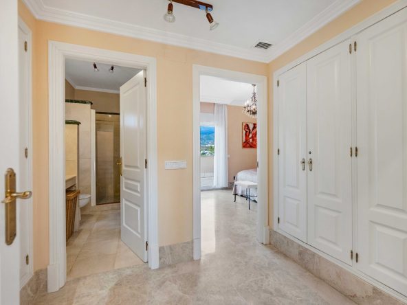 Ovenpå finner du tre romslige dobbeltrom med innebygde garderober og tre komplette bad kledd i marmor, to av soverommene med eget bad, og ett av soverommene har egen vestvendt terrasse på 13 m², ideell for å nyte solnedganger, hav- og golfutsikt.