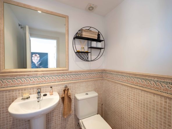 Det nyrenoverte kjøkkenet kan skilte med snekkerarbeid av høy kvalitet og førsteklasses hvitevarer. Det er beleilig plassert bak stuen og er forbundet med både stue og spisestue. Et gjestetoalett ligger også i denne etasjen.