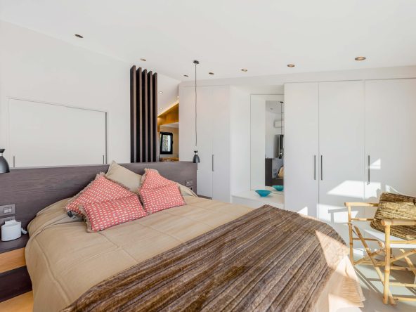 Privat hovedsuite i øvre etasje. Hele øvre etasje er dedikert til hovedsuiten, komplett med innebygde garderober, et moderne bad og en privat terrasse med havutsikt.