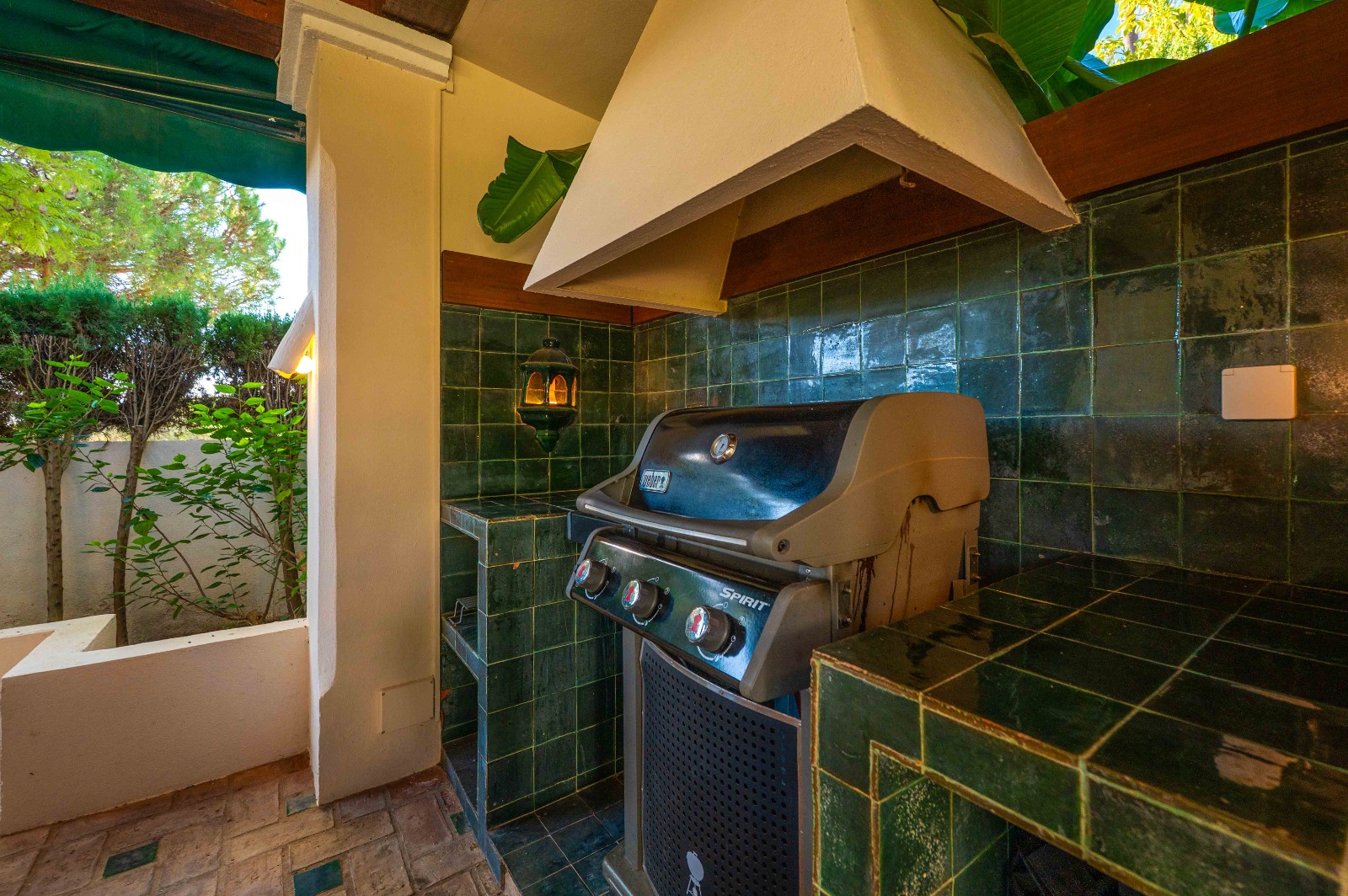 The villa’s exterior is a true haven of peace, where noble materials such as wood, ceramic, and wrought iron evoke timeless elegance. The beautifully landscaped garden, with natural grass, hedges, and palm trees, surrounds the central swimming pool finished with deep blue tiles. A built-in gazebo with a fountain and rustic brick patio creates a warm and inviting atmosphere, featuring a bench, countertop, and barbecue area — perfect for outdoor dining and gatherings with family and friends.